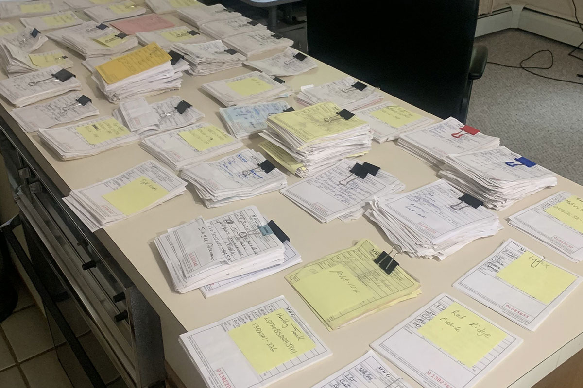 Stacks upon stacks of handwritten paper tickets spread across a desk — a physical reminder of inefficiency.